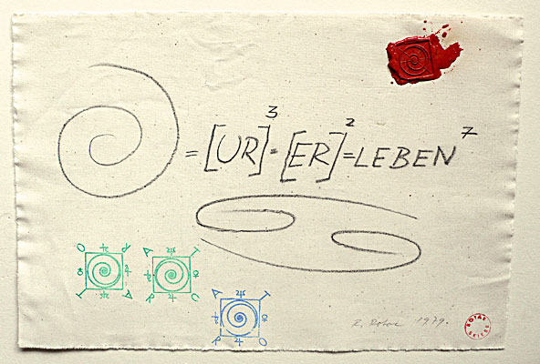 "Spirale =UR=ER=LEBEN", 1979, Spruchbild, Bleistift auf Nessel, rotes Spiral-Achtstern-Siegel, drei persönliche ROTAR-SKIEBE-Stempel, roter ROTAR-SKIEBE-Stempel, 25 x 37,5 cm, Privatsammlung